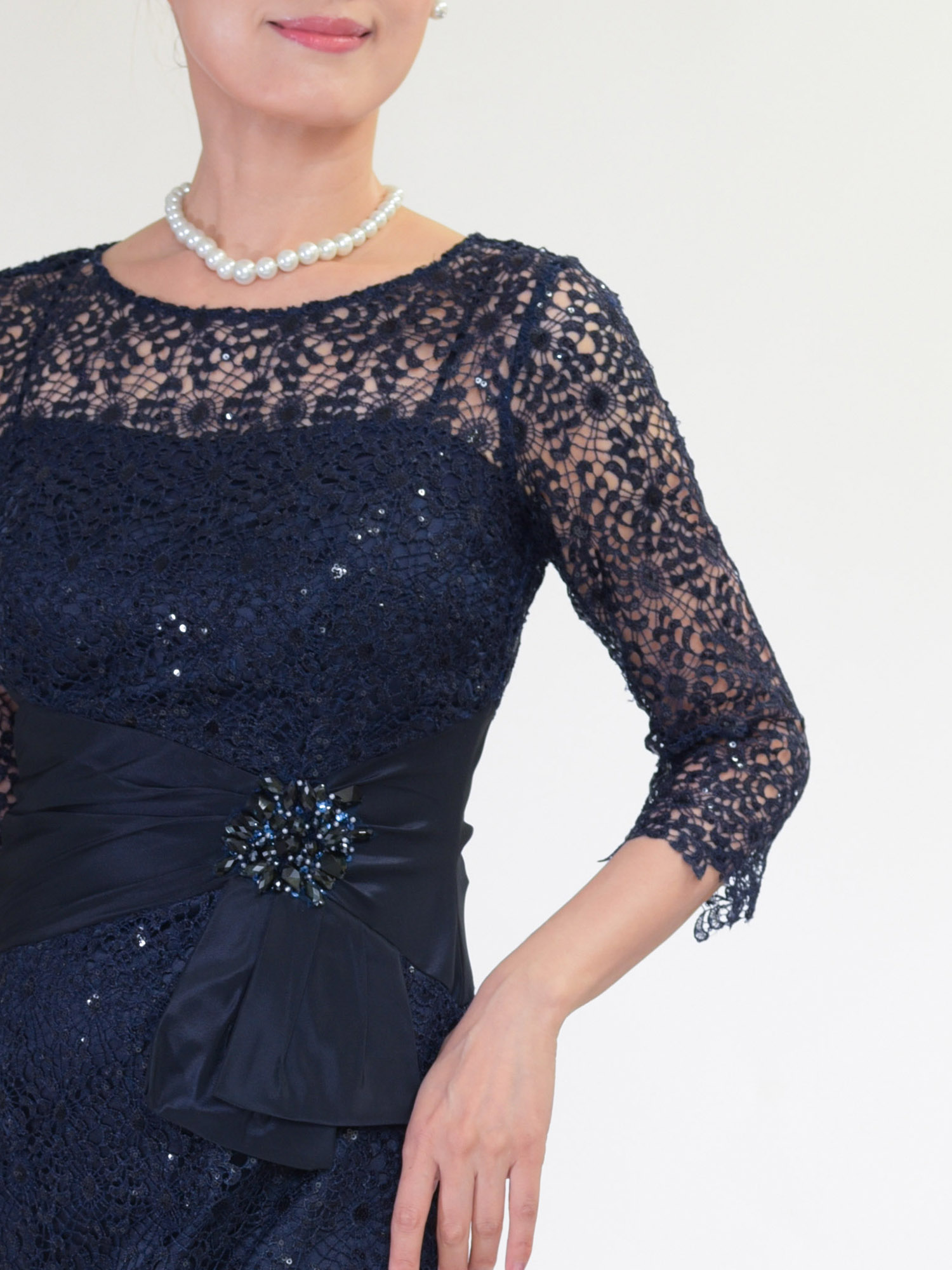 細かく特殊加工されたケミカルレースのドレスです。しなやかでありながら、型崩れしない強さも併せ持つレース生地は、ボディラインに優しく沿いつつも張り感は失わず、スタイルをよく見せる効果があります。お腹周りやヒップも目立たず、全体的に縦長のシルエットで、体形をうまくカバーしてくれる秀逸なデザインです。 レースには小さなスパンコールが全身に散りばめられていて、ドレス全体に程よい輝きを与えています。ウエスト部分には異素材のタフタ生地で、帯状の切り替えが斜めに入っています。この切り替えがさらにウエストをほっそりと見せてくれるのです。脇にはアクセントとして勲章型のビジューとリボンがついており、ドレスに華やかさをプラスしています。 襟元はやや横にひらいたボートネック。丸首よりもオシャレで、首を細く長く見せる効果もあります。袖は肘より長い7分袖。肩から腕にかけてはレースが透けて肌が見えるようなデザインですが、とても細かいレースなので透け感は気にならないほうでしょう。タイトなデザインのため、歩きやすいよう後ろにスリットが入っています。