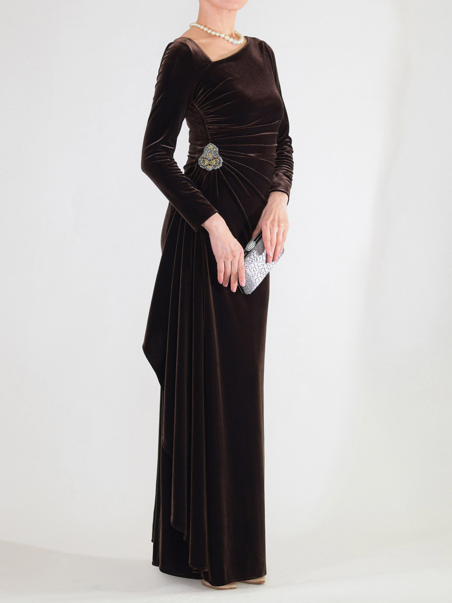 光沢と厚みのある高級なベルベット生地を使用したシンプルなドレスです。ネックラインは左右アシンメトリーになっていて、首元がすっきりと見えるカットです。シルエットはボディラインに沿っていますが、ウエスト周りはななめに寄せたドレープがお腹周りをカバー、脇には上品なビジューが控えめについています。。ボトムは巻きスカート風になっていて、ベルベット特有のツヤのありドレープがウエストから裾にかけて波打ち、、下半身のラインを美しく見せてくれます。 袖は長めで、手首のところに生地が少したまるようなデザイン。袖口がしぼってあるので、袖が長くても手首のところで留まるようにできています。生地が厚手で重さがあり、スカート部分の落ち感もとてもきれい。無駄なしわなどがよりにくいのが特徴です。さらにストレッチの効いた素材ですから動きを制限されず、着ていて楽なのも嬉しいポイント。露出も控えめで、目上の方からも支持を得られるドレスですから、安心してきていただけます。