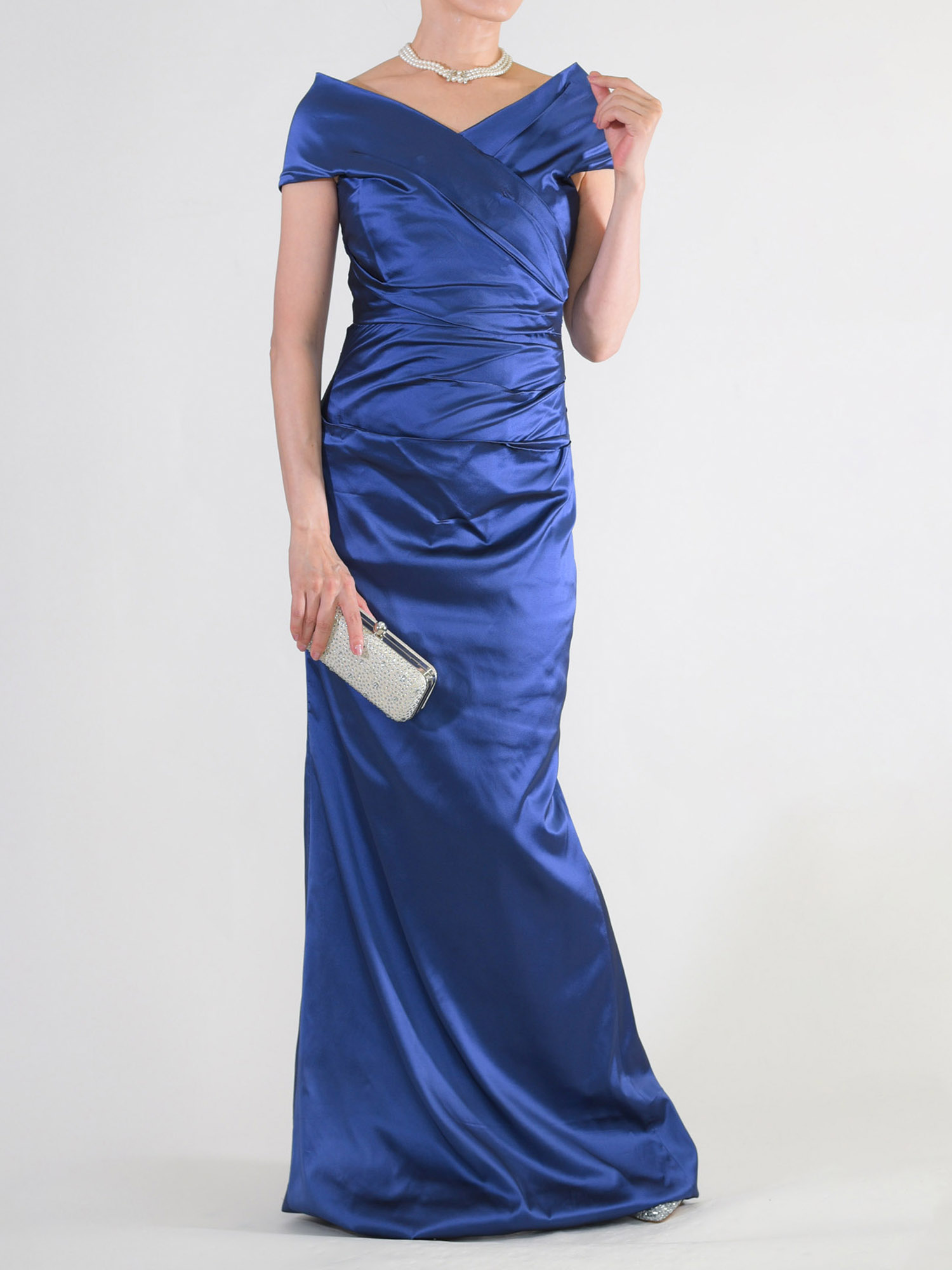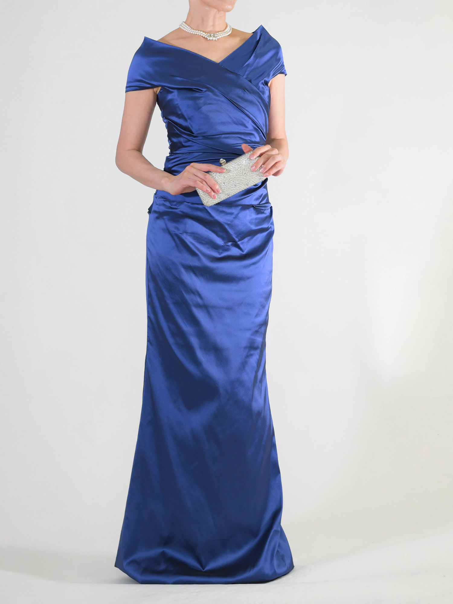 L-84ブルーグレーの色違いドレス、ロイヤルブルーです。ビジューやレースを使っていないとてもシンプルなデザインですが、光沢のある上質な生地で作られてあり、着るとシックな大人の華やかさがあります。生地は軽くて伸縮性がありますから、締め付け感がなく着ていてとても楽。 色はロイヤルブルーというイギリス王室の青色。鮮やかな色味ですが、決して派手ではなく、ネイビーよりは涼やかな明るさがあります。 写真ですと細身の形に見えますが、胸元からウエストに斜めにタックが入っていて、それがウエスト周りをうまくカバーしてくれます。 襟は左右合わせのV字ネック。このV字の襟にネックレスがきれいにおさまり、ネックラインをスッキリ見せます。 肩は流行のオフショルタイプで、少し肩を落として着ていただくのが今風です。肩山から二の腕を覆うデザインなので、袖なしですが腕が思う以上にほっそり見えると思います。 歩きやすいように後ろにはスリットが入っています。