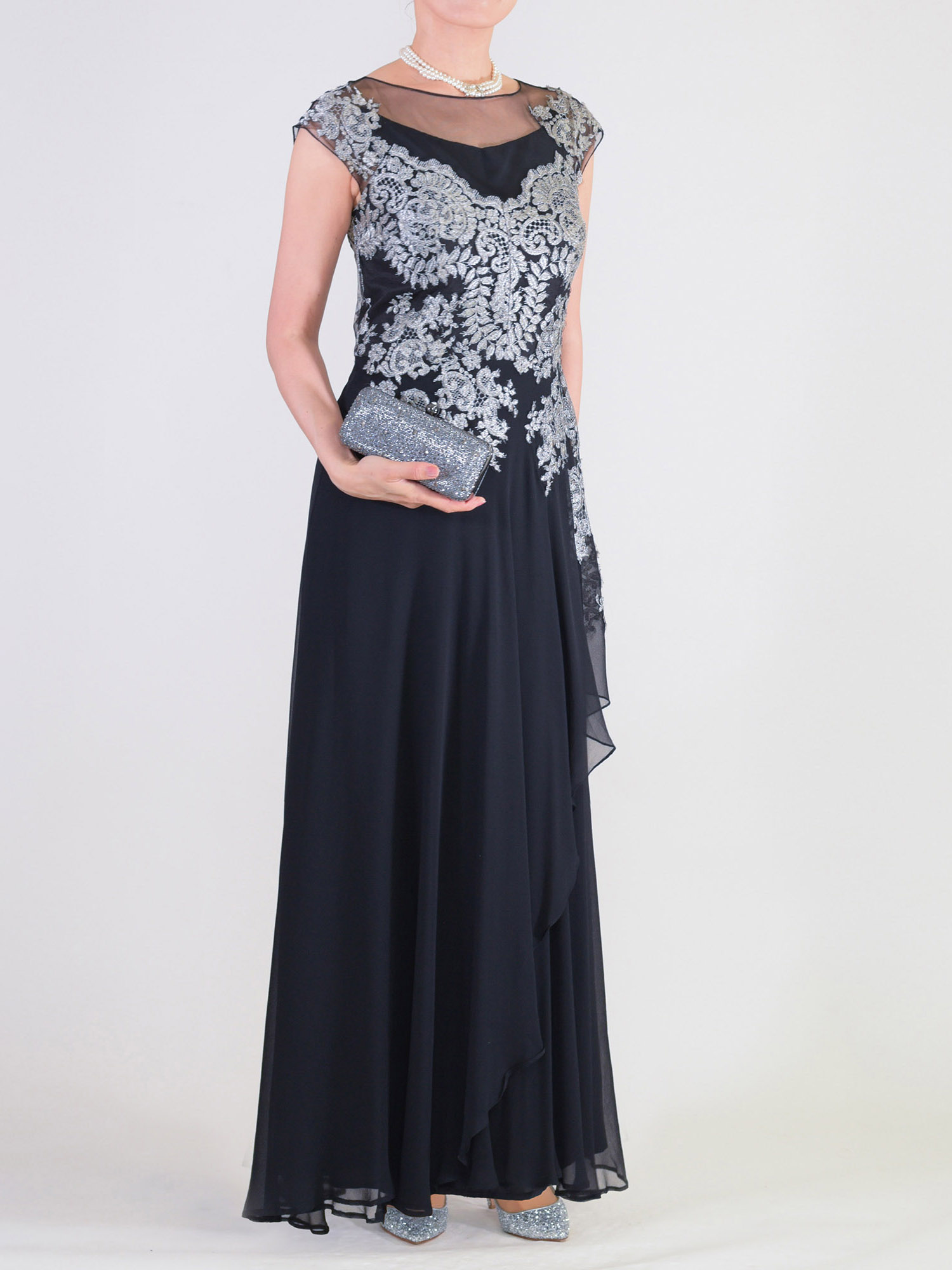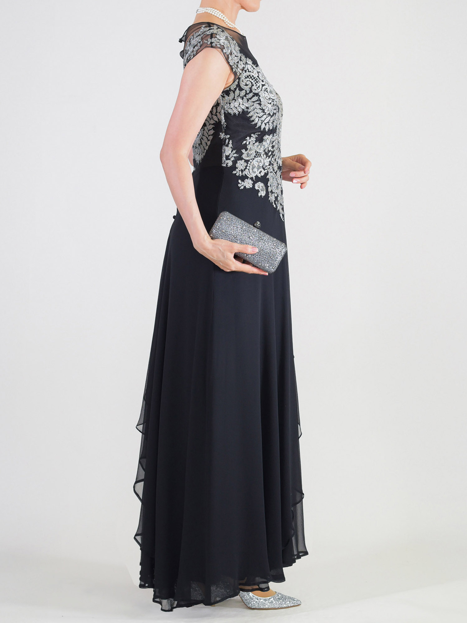 ブラックのシルクシフォンにシルバーの刺繍がほどこされた、シックでモダンなドレスです。シルバーの刺繍部分の模様はとても細かく繊細で、それがシルクシフォンの生地に手縫いで付けられていて、とても手の込んだ仕立てとなっています。襟元は細かいメッシュのレース地で、襟は丸首ではなく横に長いボートネック。このラインが首筋からデコルテを上品に見せてくれます。袖はフレンチスリーブで肩山と二の腕の上の部分がちょうど隠れるくらい。胸元から肩にかけてシルバーの刺繍がエレガンントに飾り、顔周りに明るさをプラス。そのため黒のドレスですが、暗い印象にならず、おめでたい場にもふさわしいデザインです。胸元からウエスト、身頃の左部分へと流れるアシンメトリーの刺繍は、スタイルをほっそりと見せてくれる効果があります。 スカート部分はシルクシフォンが二重になっていて、動くたびにそのシルクシフォンが軽やかに揺れるところはとてもエレガント。シルク素材なので大変軽く、着ていて負担がかからず楽に着ていただけます。