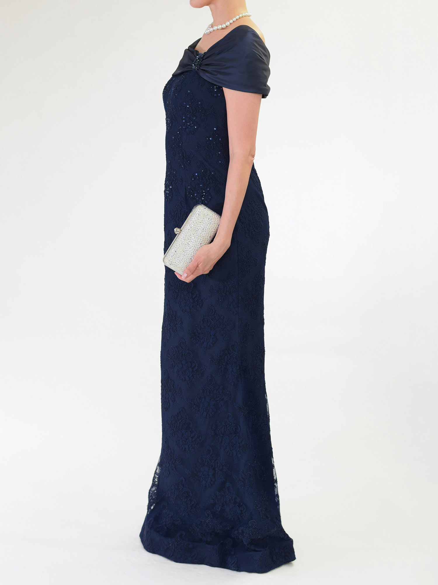 総レースのマーメイドラインのドレスです。レースの生地は高級なものを使用しており、レース地の上に繊細な刺繍が施されています。さらに上半身には華やかさを加えるためスパンコールが散りばめられていてゴージャスな仕上がりに。ウエストから下の部分にはスパンコールがついていないので、派手すぎることもなく上品で洗練されたデザインです。 全体的にはマーメイドのシルエット。上から下まで1枚の布で仕立ててあり、ウエスト部分に切り替えがありません。立体的なパターンで作られていますから、ボディが入るときれいな流線型のマーメイドラインが完成します。 首周りは張りのあるタフタ素材の襟がついていて、これが胸元に程よいボリュームを与えています。そのため顔周りも明るくふわっとした印象に。肩山から上腕部分までタフタのカラーがすっぽりと包み込むため、気になる二の腕もカバーされて袖がなくても安心して着ていただけます。