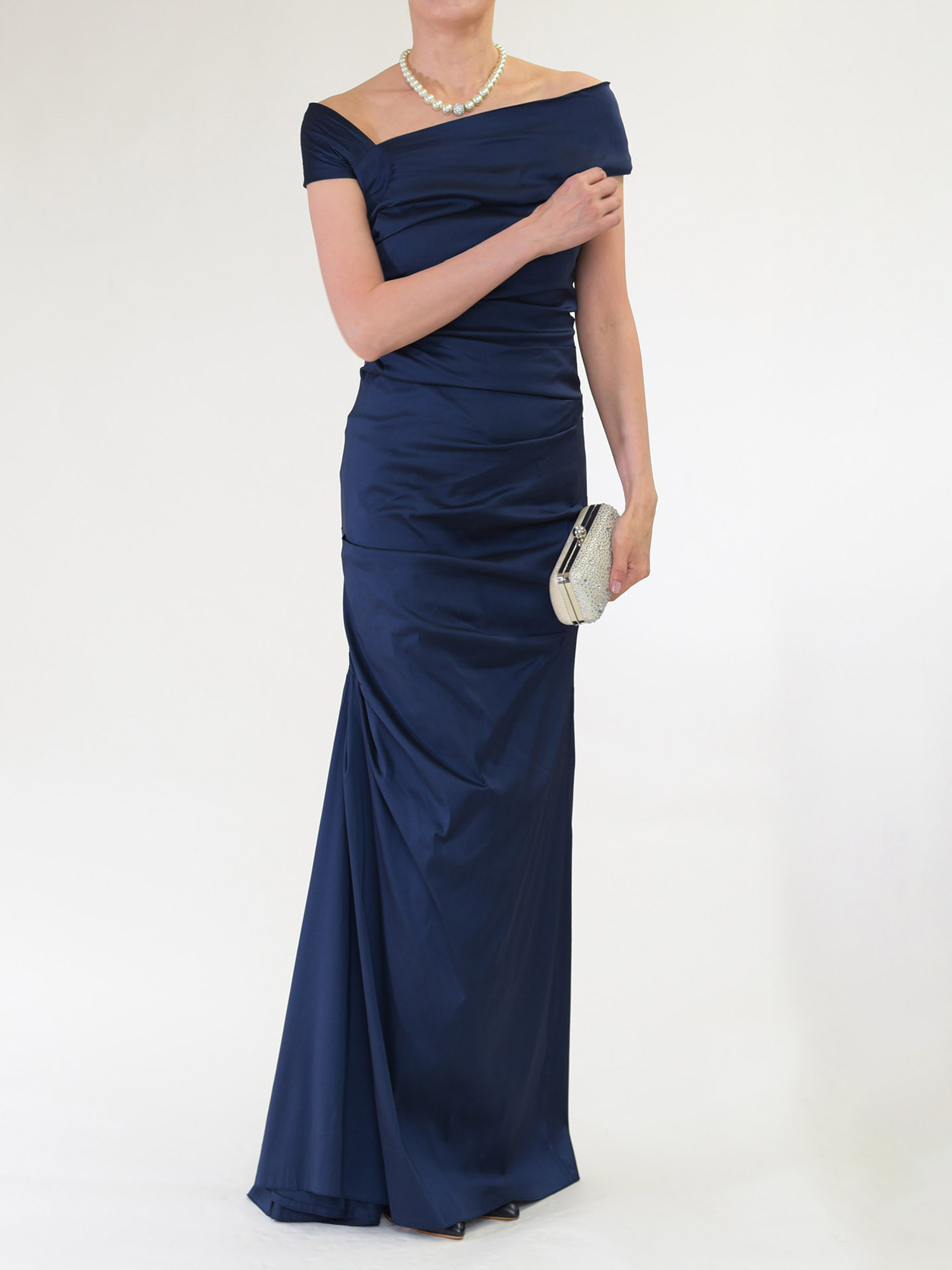 ストレッチの効いた光沢のある生地で作られた、デザイン性の高いドレスです。ビジューなどの飾りは一切ついていませんが、デザインが凝っていてアシンメトリーなスタイル。スカート部分は左右でデザインが違っていて、右側にタックが寄せられていてボリュームがあるスタイル。左側はタックが少なくスレンダーなラインになっています。 襟元のあきもアシンメトリーで、鎖骨がきれいに見える絶妙に計算されたデザイン。胸元があきすぎることもありません。 胸元があきすぎることもありません。 ストレッチが効いた生地は軽く、着ていてとても楽なのが特徴です。細みのシルエットに見えますが、ウエスト部分には程よくひだが入っていて、予想以上に体型をカバーしてくれます。シンプルにセンスよく着こなしたいお母様にお勧めのドレスです。