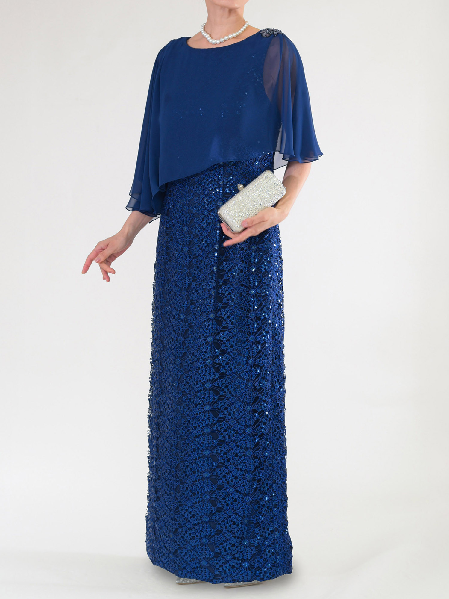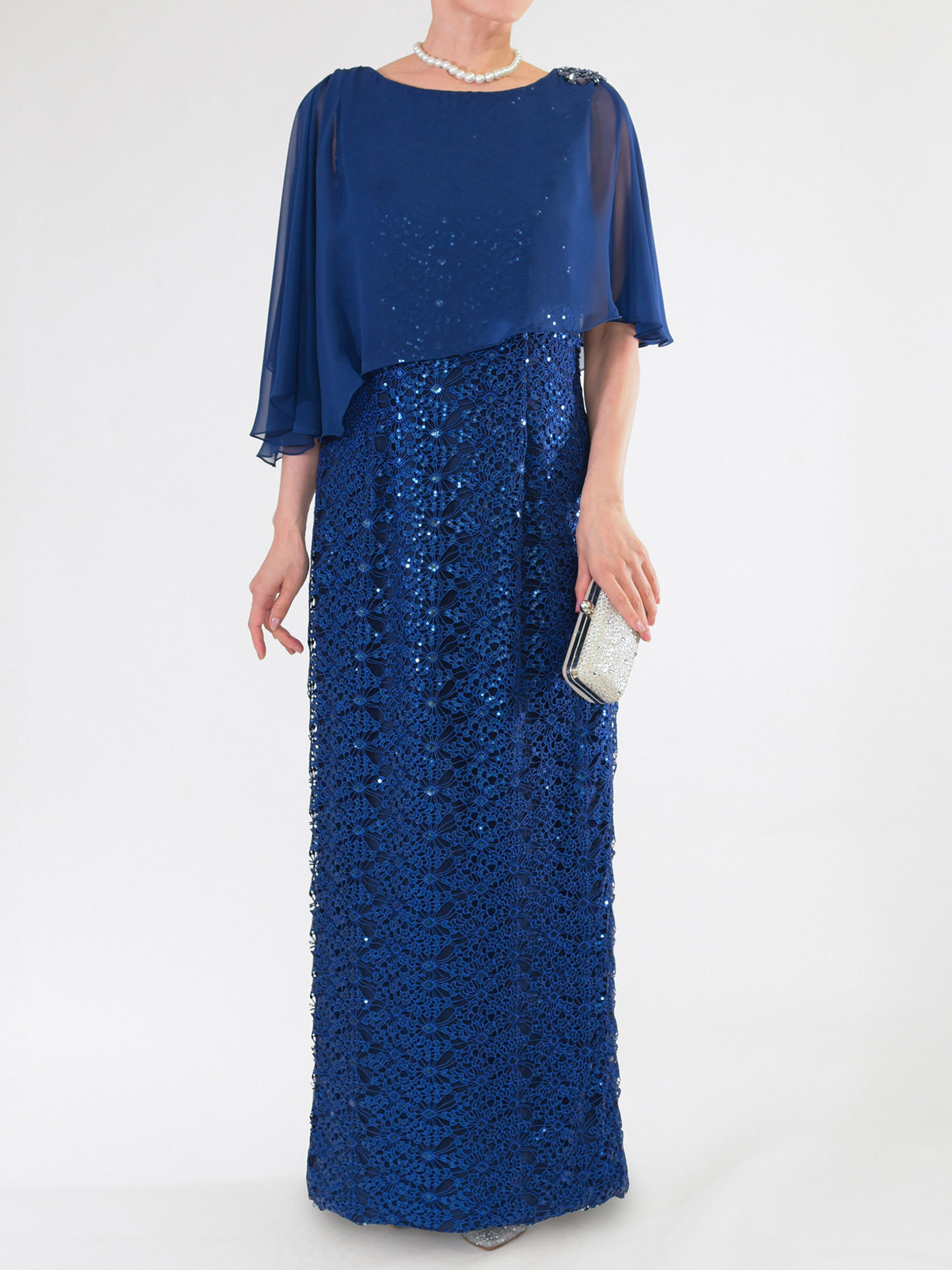 全体にスパンコールが織り込まれた華やかでゴージャスなレース生地を贅沢に使用したフォーマルドレスです。 切り替えの無いストンとしたストレートのシルエットでウエスト周りを締め付けず、とても動きやすく着心地もラクです。 しっかりとした重厚感のあるレースは身体のラインを拾い過ぎず、且つ、生地の重さで身体に沿って落ちるため余分なもたつきも無く、すっきりと着やせする秀逸なカバー力が頼れる1着です。 ショート丈のシフォン生地がケープのようにふんわりと上半身をカバー。斜めのラインが全身をスッキリと縦長に見せ、お腹周りやバスト、二の腕も目立たないデザインです。 シフォンから身頃のスパンコールが動作に合わせてキラキラと透ける様子もさりげなく上品な華やかさを演出します。