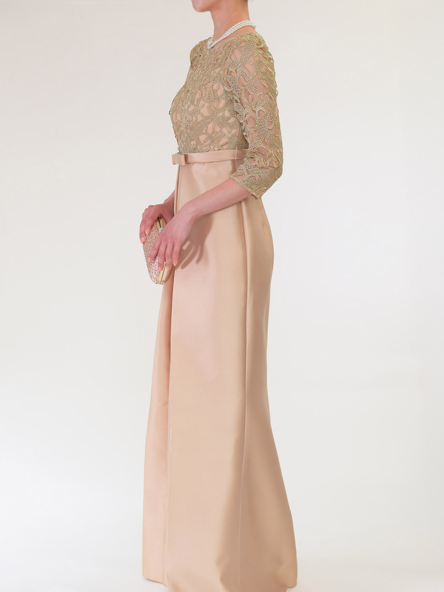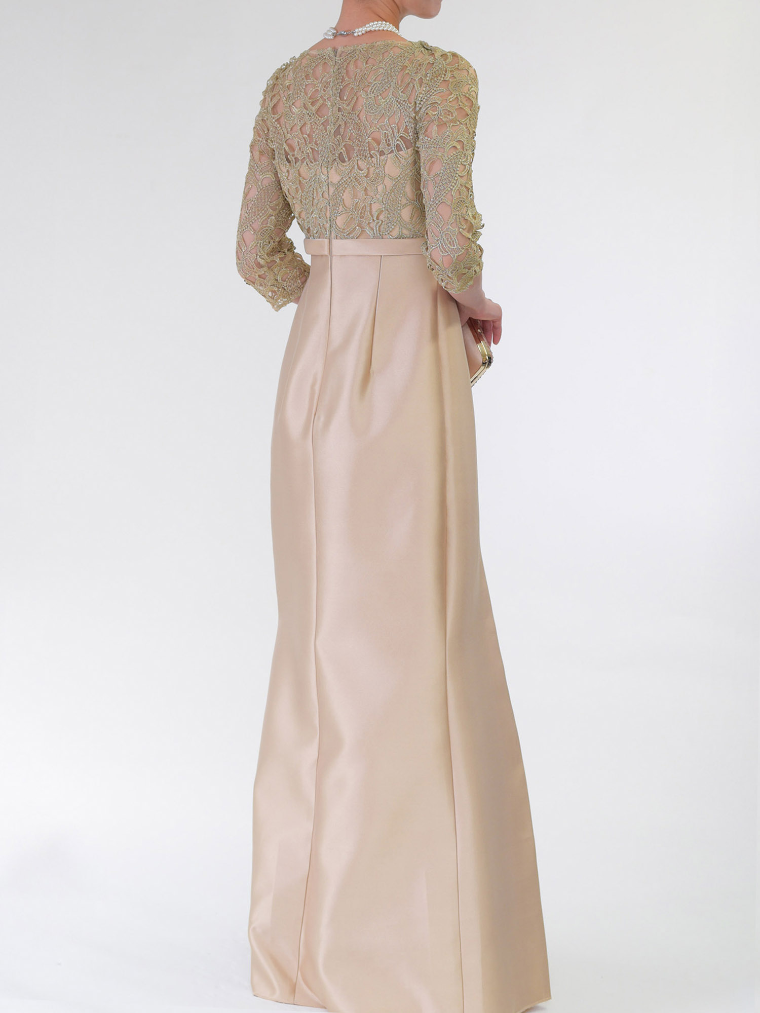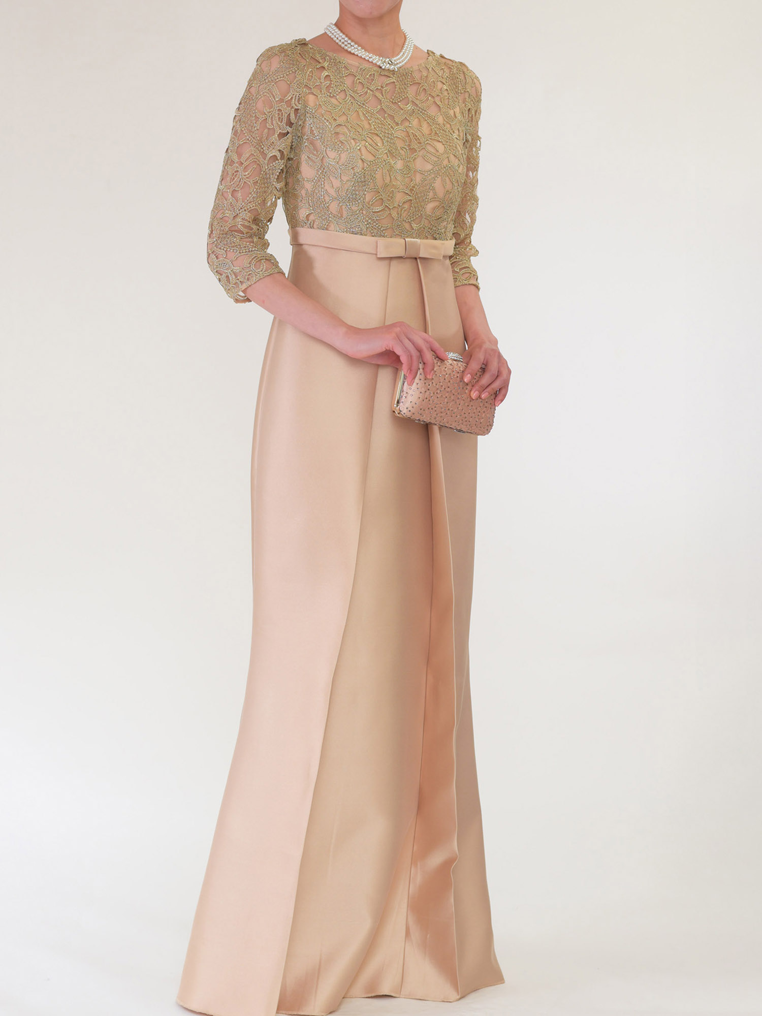 華やかなシャンパンゴールドのカラーと、膝を絞りすぎず緩やかなカーブを描くマーメードラインがとてもエレガントなフォーマルドレスです。 シャンパンやシルバーなどの華やかで明るい色のフォーマルドレスを着たいけれど、写真を撮った時に白っぽく写ってしまうのは避けたい、という方にもおすすめです。 ゴールドのラメ糸が織り込まれたレース生地はビジューなどの装飾もなく、肌馴染みの良い色合いですので、派手になり過ぎることはなく、落ち着いたフォーマルで上品な印象です。 ハイウエストの切り替えと裾まで入ったタックが作る縦のラインがスラリと脚長に見せるので、華奢で小柄な体型で、ドレスを着るとウエストの位置が落ちて重心が下がってしまいがちな方もバランス良く着用していただきやすいデザインです。