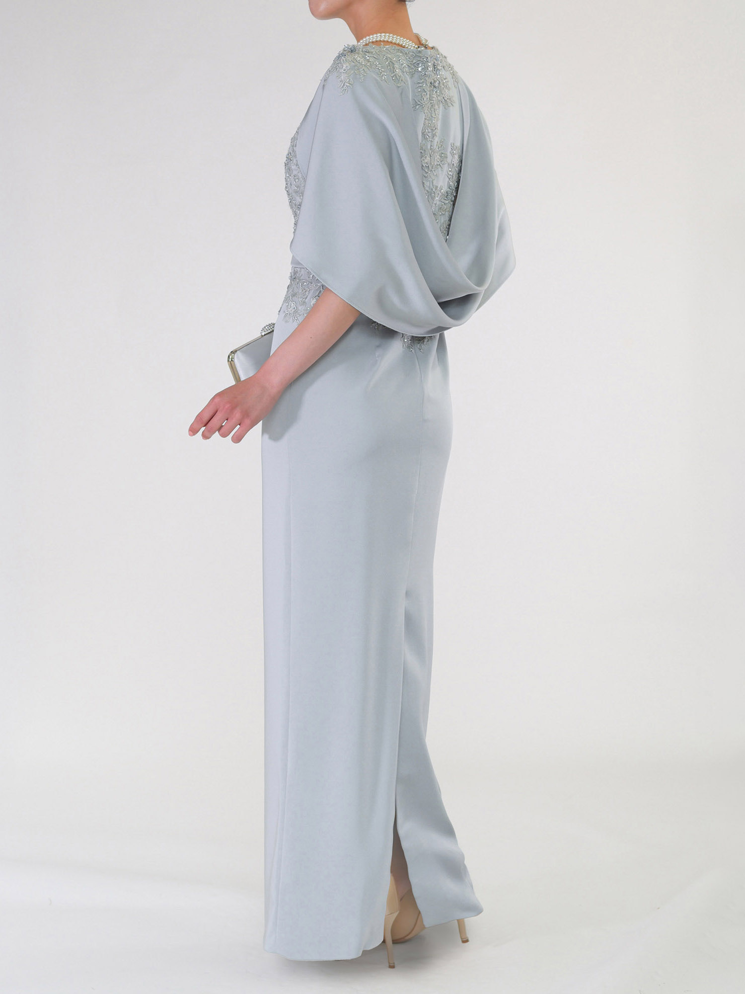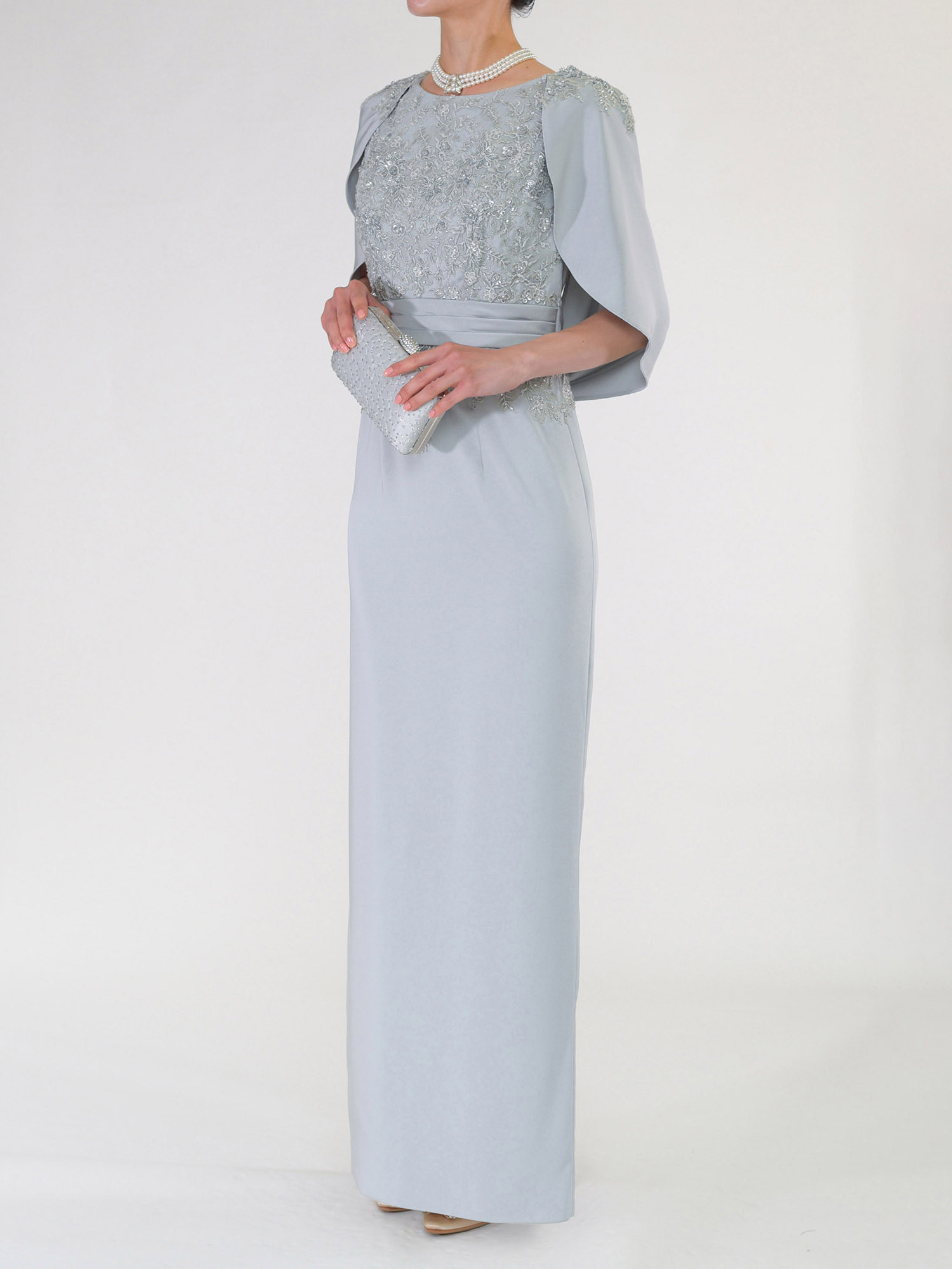 落ち着いた光沢が美しいシルバーカラーが、お顔まわりを明るく引き立て、式場の照明にも映える華やかさを演出。身体に沿いすぎないストレートラインが自然な縦のラインを作り、すっきりとした美しいシルエットを実現します。ウエストのベルトデザインが全体を引き締め、スタイルアップ効果も抜群。肩からふわりと重なるレースケープが二の腕や上半身をエレガントにカバーし、露出を控えつつも華やかな印象に。パールアクセサリーやクラッチバッグとの相性も良く、写真映えと安心感を両立する、大人の女性にふさわしい一着です。