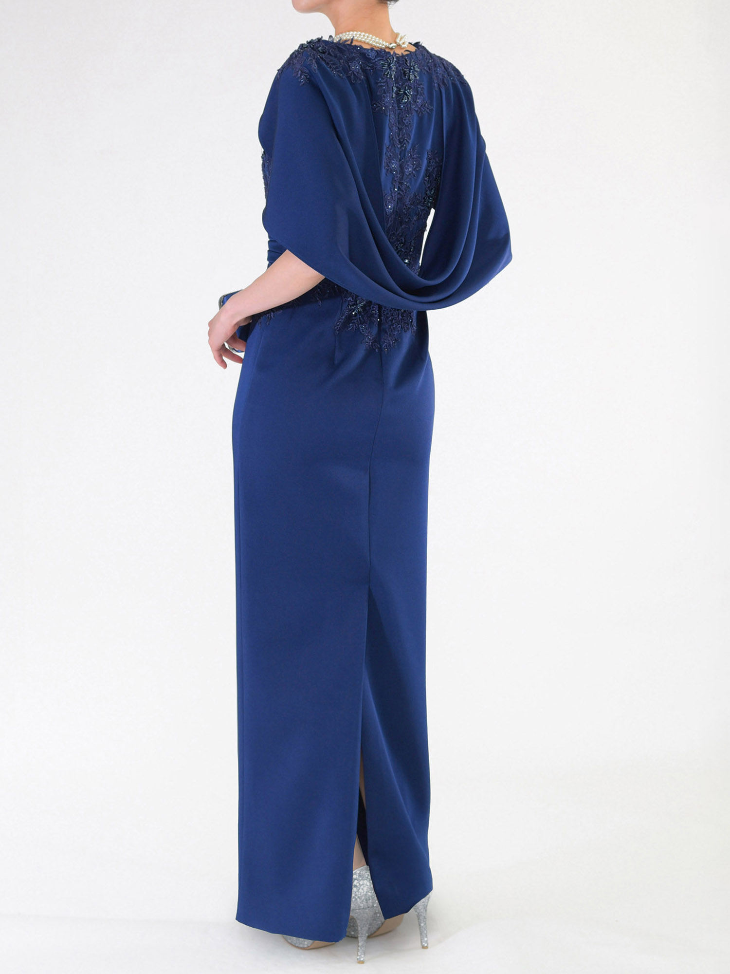 深みのあるネイビーカラーにビジューの煌めきが映える、母親の晴れ姿にふさわしい一着。上品な光沢感と縦のラインを美しく引き出すストレートシルエットが、スタイルをすっきり見せながら優雅な雰囲気を演出します。胸元やウエスト部分に施されたビジュー装飾が、光の角度によって上品にきらめき、写真映えも抜群。肩まわりを包み込むレースケープ風のデザインは、二の腕をさりげなくカバーしつつ、動きやすさと安心感を両立します。華美すぎず控えめすぎない絶妙なバランスが、結婚式という特別な日にぴったり。格式と華やかさを兼ね備えた、大人の女性のためのフォーマルドレスです。