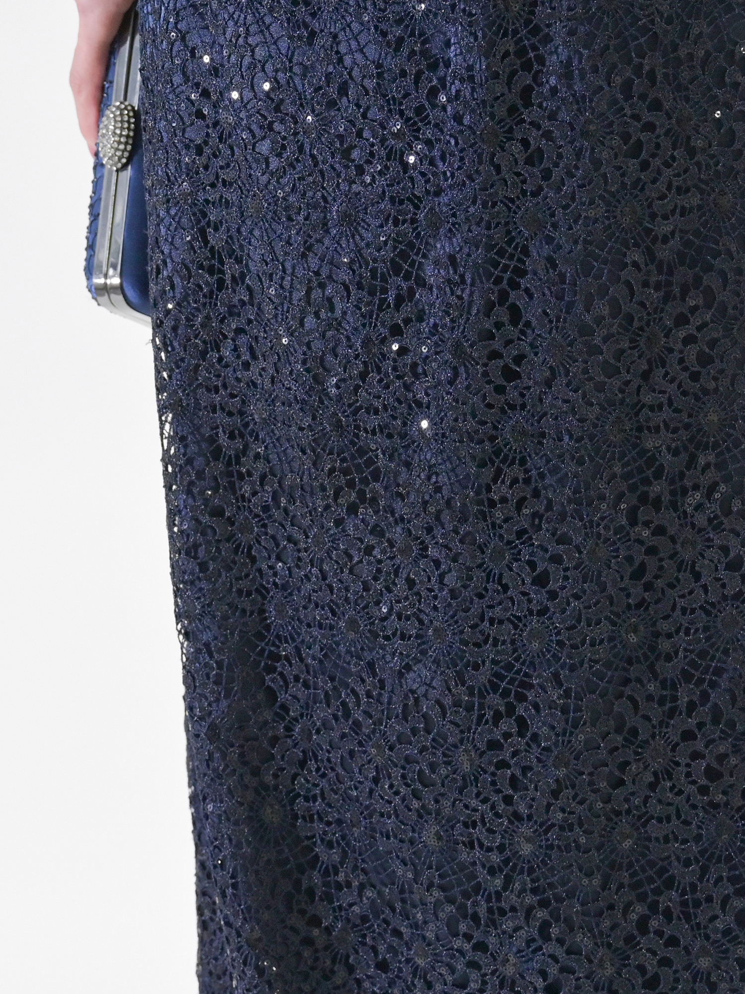 細かく特殊加工されたケミカルレースのドレスです。しなやかでありながら、型崩れしない強さも併せ持つレース生地は、ボディラインに優しく沿いつつも張り感は失わず、スタイルをよく見せる効果があります。お腹周りやヒップも目立たず、全体的に縦長のシルエットで、体形をうまくカバーしてくれる秀逸なデザインです。 レースには小さなスパンコールが全身に散りばめられていて、ドレス全体に程よい輝きを与えています。ウエスト部分には異素材のタフタ生地で、帯状の切り替えが斜めに入っています。この切り替えがさらにウエストをほっそりと見せてくれるのです。脇にはアクセントとして勲章型のビジューとリボンがついており、ドレスに華やかさをプラスしています。 襟元はやや横にひらいたボートネック。丸首よりもオシャレで、首を細く長く見せる効果もあります。袖は肘より長い7分袖。肩から腕にかけてはレースが透けて肌が見えるようなデザインですが、とても細かいレースなので透け感は気にならないほうでしょう。タイトなデザインのため、歩きやすいよう後ろにスリットが入っています。