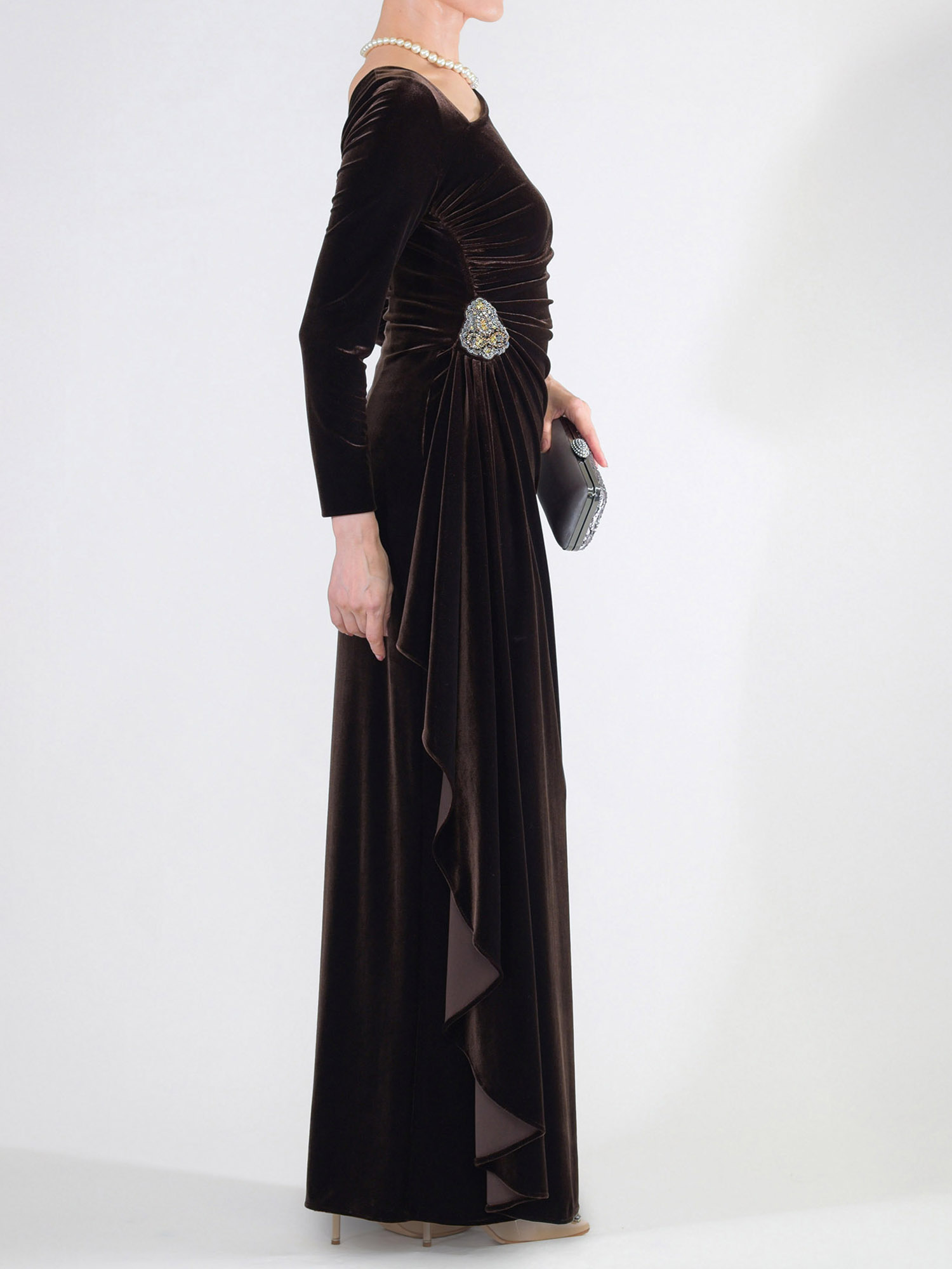 光沢と厚みのある高級なベルベット生地を使用したシンプルなドレスです。ネックラインは左右アシンメトリーになっていて、首元がすっきりと見えるカットです。シルエットはボディラインに沿っていますが、ウエスト周りはななめに寄せたドレープがお腹周りをカバー、脇には上品なビジューが控えめについています。。ボトムは巻きスカート風になっていて、ベルベット特有のツヤのありドレープがウエストから裾にかけて波打ち、、下半身のラインを美しく見せてくれます。 袖は長めで、手首のところに生地が少したまるようなデザイン。袖口がしぼってあるので、袖が長くても手首のところで留まるようにできています。生地が厚手で重さがあり、スカート部分の落ち感もとてもきれい。無駄なしわなどがよりにくいのが特徴です。さらにストレッチの効いた素材ですから動きを制限されず、着ていて楽なのも嬉しいポイント。露出も控えめで、目上の方からも支持を得られるドレスですから、安心してきていただけます。