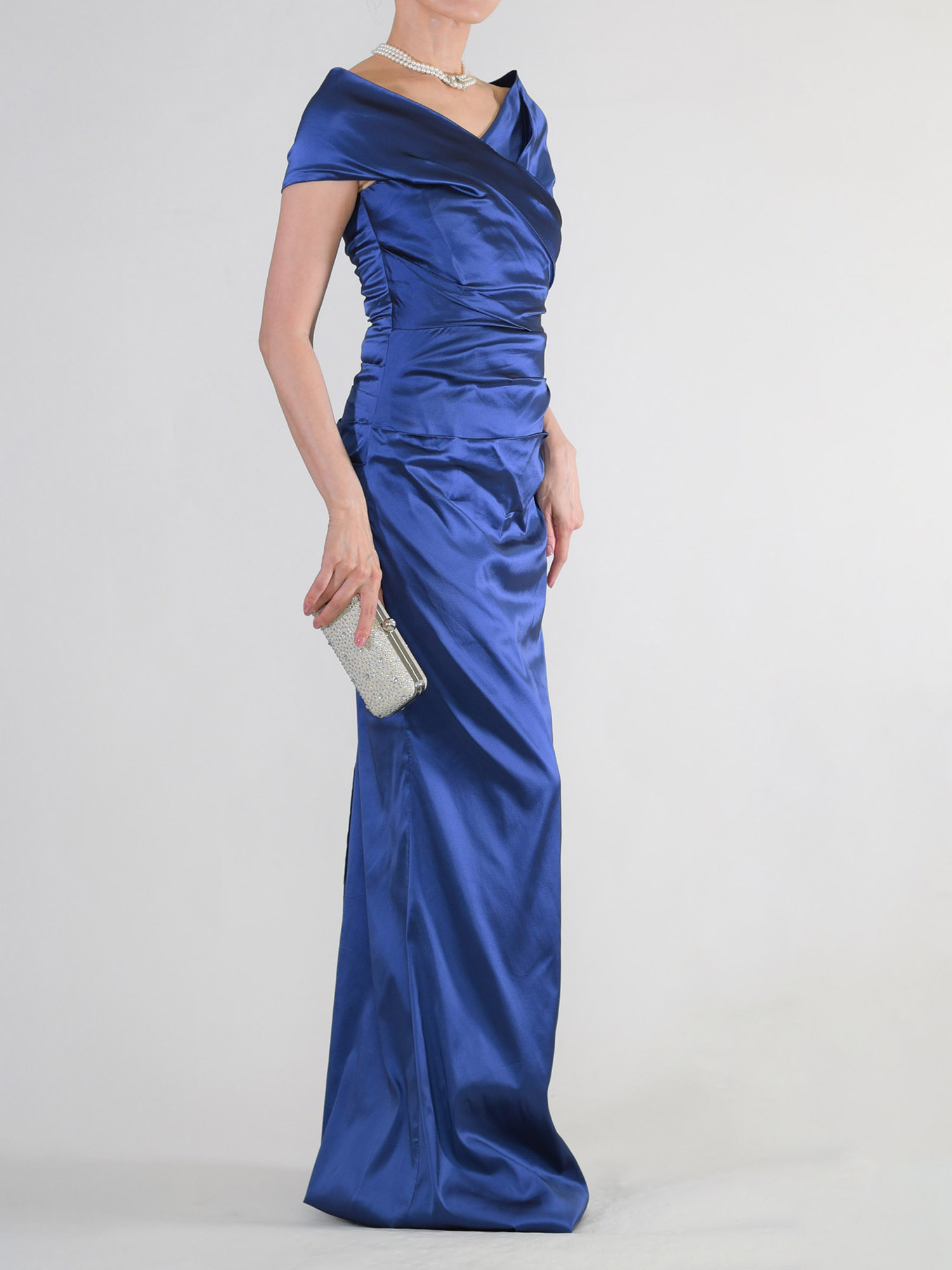 L-84ブルーグレーの色違いドレス、ロイヤルブルーです。ビジューやレースを使っていないとてもシンプルなデザインですが、光沢のある上質な生地で作られてあり、着るとシックな大人の華やかさがあります。生地は軽くて伸縮性がありますから、締め付け感がなく着ていてとても楽。 色はロイヤルブルーというイギリス王室の青色。鮮やかな色味ですが、決して派手ではなく、ネイビーよりは涼やかな明るさがあります。 写真ですと細身の形に見えますが、胸元からウエストに斜めにタックが入っていて、それがウエスト周りをうまくカバーしてくれます。 襟は左右合わせのV字ネック。このV字の襟にネックレスがきれいにおさまり、ネックラインをスッキリ見せます。 肩は流行のオフショルタイプで、少し肩を落として着ていただくのが今風です。肩山から二の腕を覆うデザインなので、袖なしですが腕が思う以上にほっそり見えると思います。 歩きやすいように後ろにはスリットが入っています。