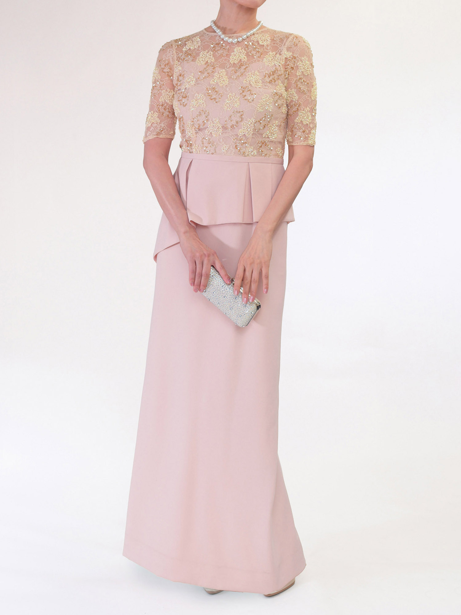 画像では白っぽく見えますが、ソフトなベビーピンクの優しいお色味です。トップはとても手の込んだシースルーレースに、細かいスパンコールが散りばめられている高級な素材。レース生地は細い糸で丁寧に編まれており、とても繊細。肌触りもソフトです。襟元はクルーネックで、胸元には肌が透けて見えないよう裏地がついているので露出しすぎないデザインに。レースの袖は肘のあたりまでくる五分袖。気になる二の腕もレースの花模様がうまく隠してくれます。 ボトムは上質で肌触りの良いジョーゼット地。程よい厚みがありますから、スカート部分の落ち感もきれい。ストレートのフォルムがとても美しく出てきます。身幅が適度にあるので、下半身のボディラインも目立ちません。ウエストにはアシンメトリーのペプラムが施されて、気になるお腹や腰周りをしっかりカバー。ストレートのラインなので、歩きにくくないよう後ろにはスリットが入っています。