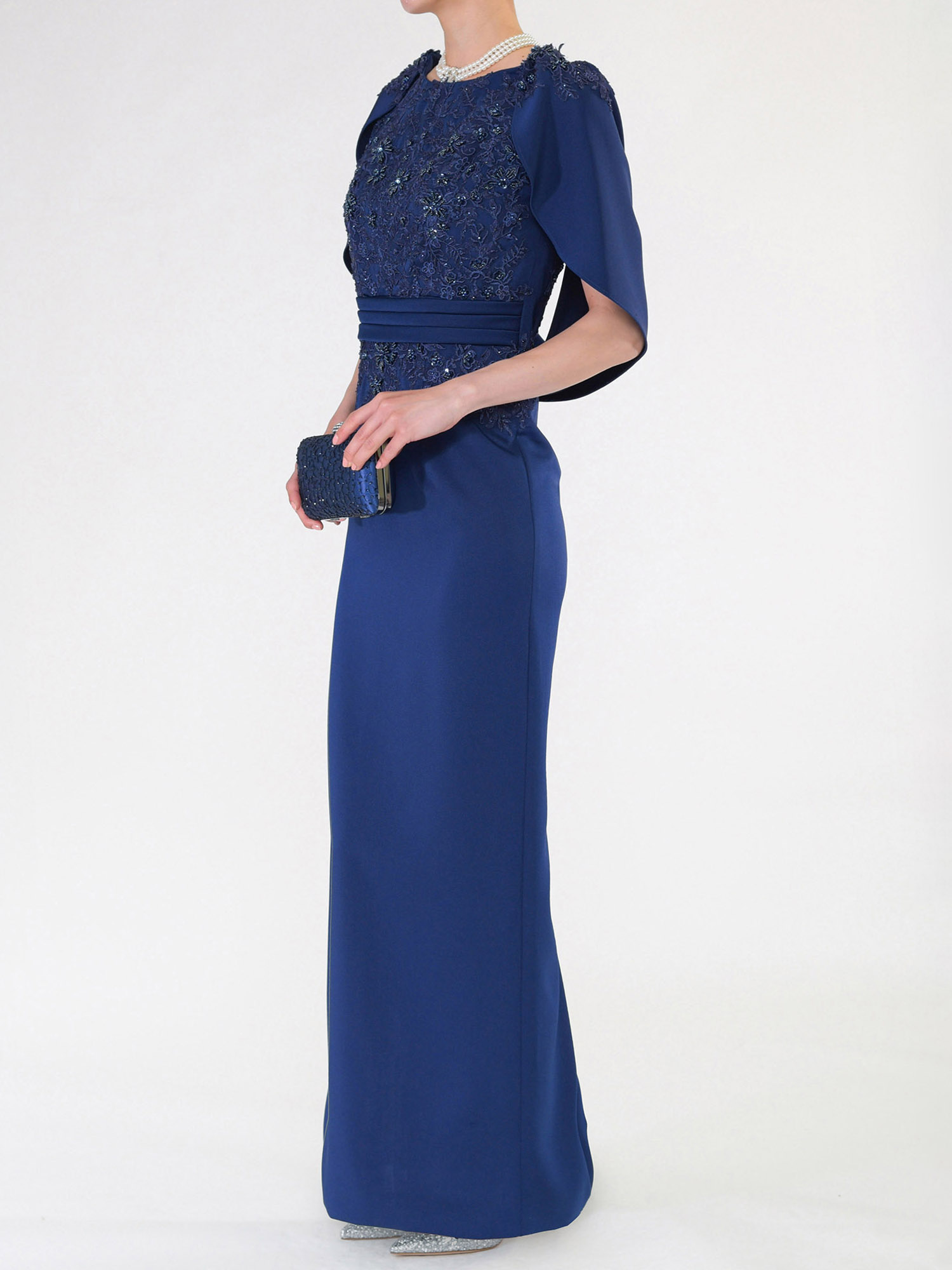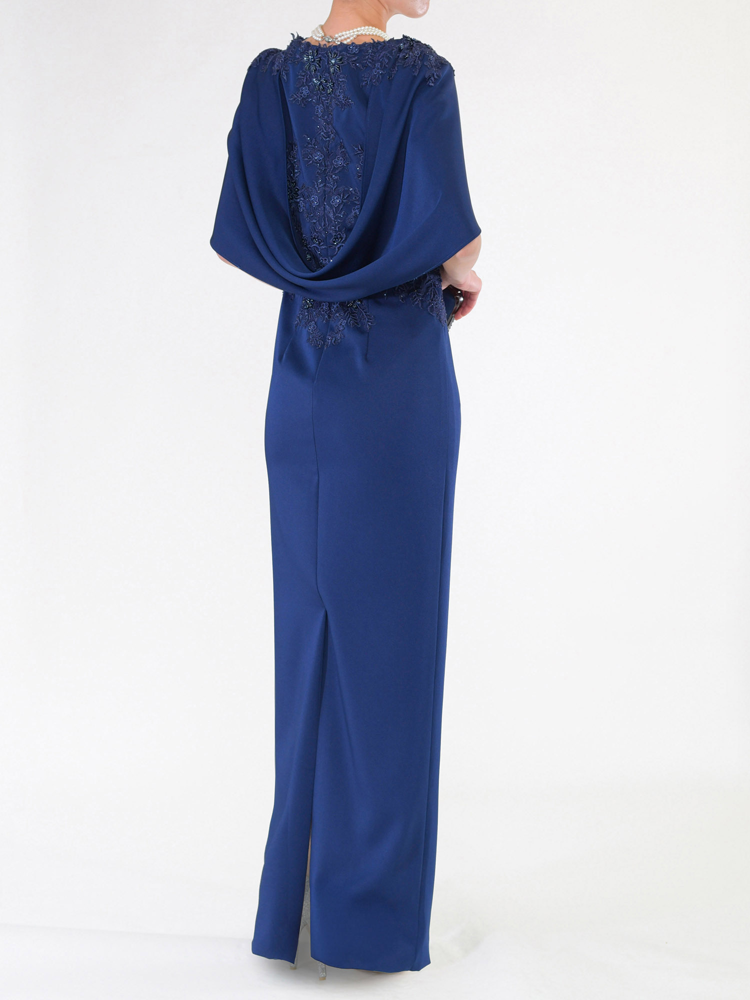 深みのあるネイビーカラーにビジューの煌めきが映える、母親の晴れ姿にふさわしい一着。上品な光沢感と縦のラインを美しく引き出すストレートシルエットが、スタイルをすっきり見せながら優雅な雰囲気を演出します。胸元やウエスト部分に施されたビジュー装飾が、光の角度によって上品にきらめき、写真映えも抜群。肩まわりを包み込むレースケープ風のデザインは、二の腕をさりげなくカバーしつつ、動きやすさと安心感を両立します。華美すぎず控えめすぎない絶妙なバランスが、結婚式という特別な日にぴったり。格式と華やかさを兼ね備えた、大人の女性のためのフォーマルドレスです。
